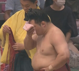 炎鵬は貴源治との対戦で下アゴに強烈な張り手をくらい、顔から血を流して目はうつろでフラフラに。